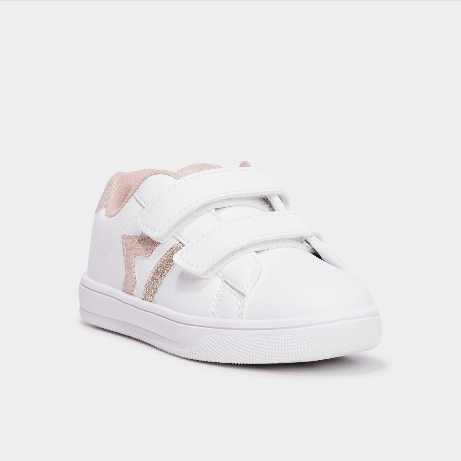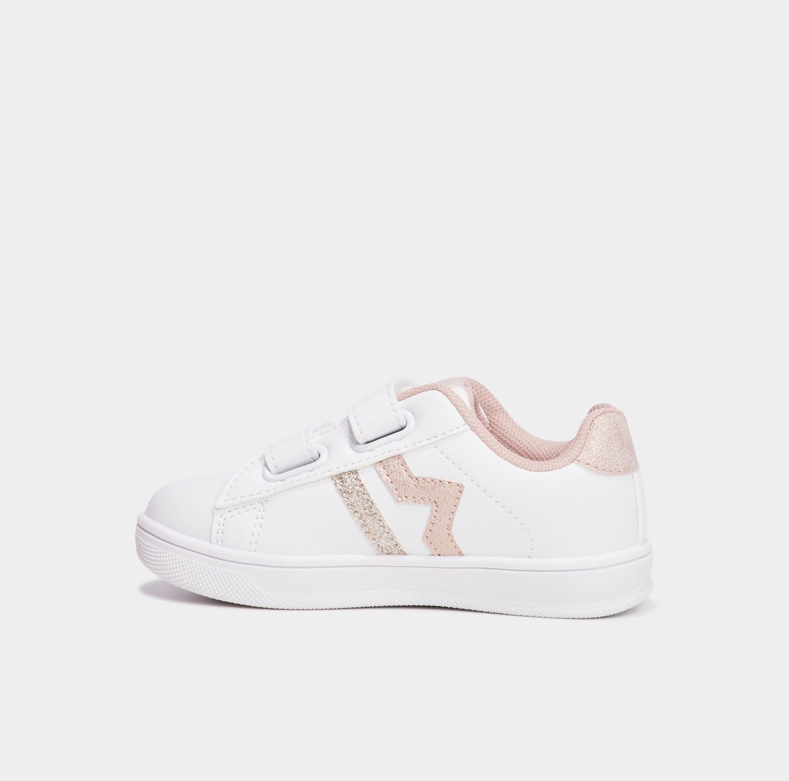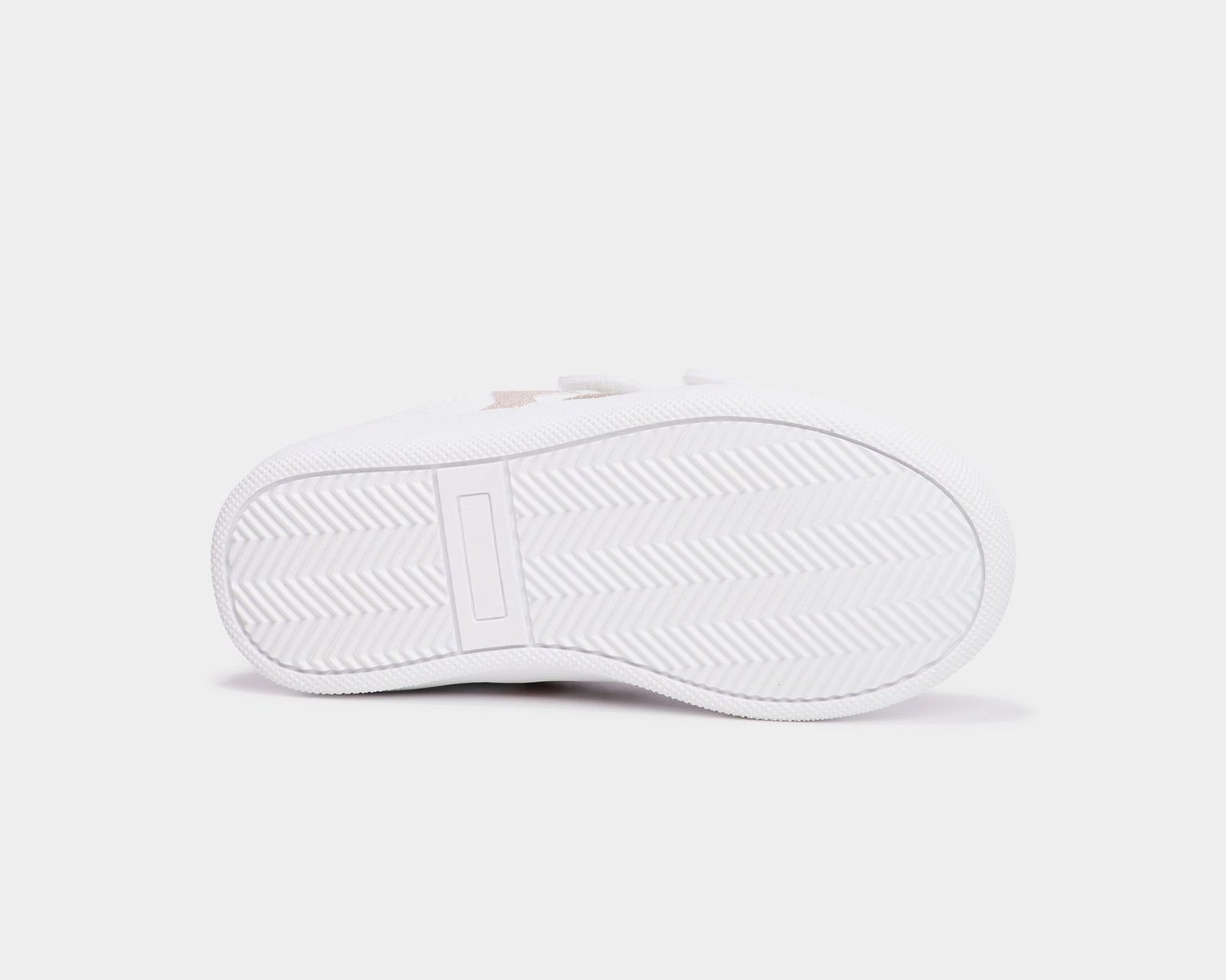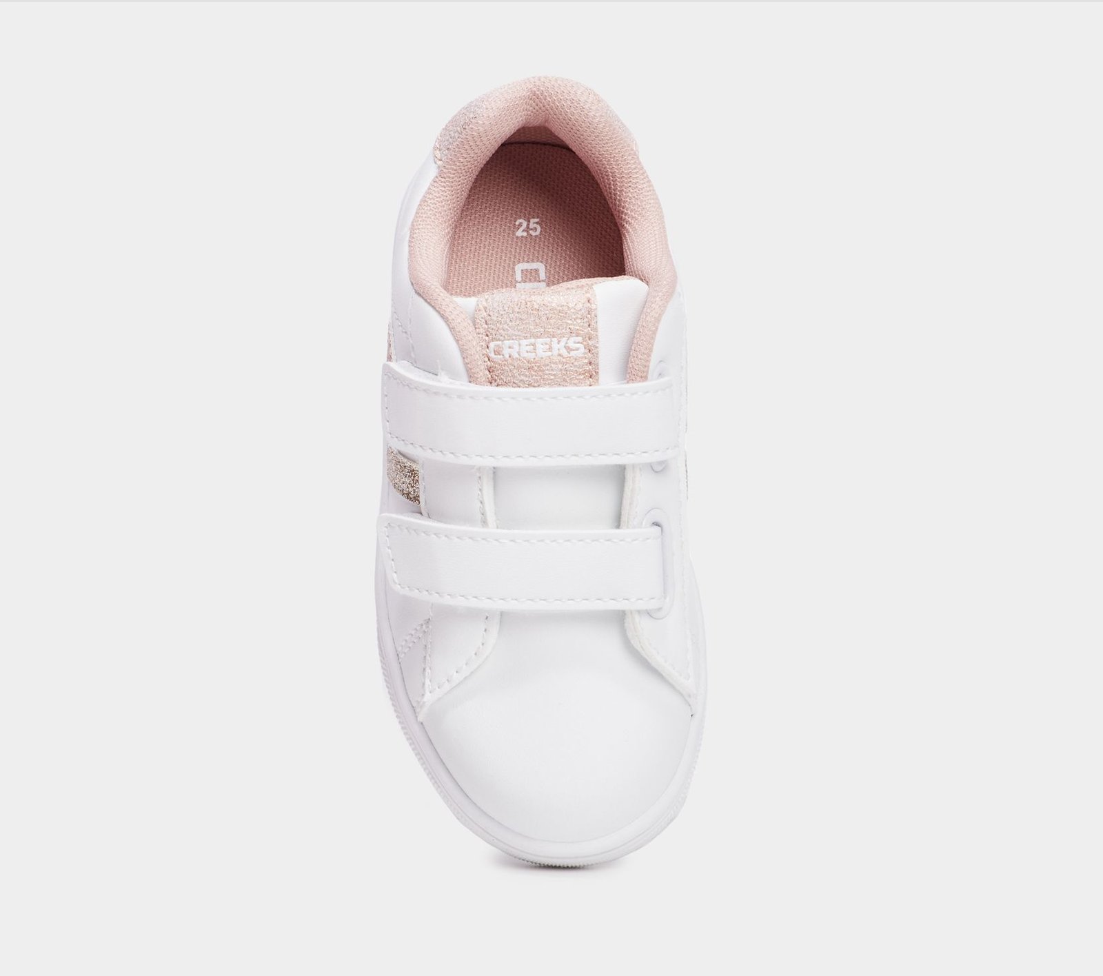 Ces tennis basses de la marque Creeks allient simplicité et élégance. De couleur blanche, elles se distinguent par 2 bandes (une simple et une autre en V) sur le côté, apportant une touche de féminité et de fraîcheur à la tenue de votre petite princesse. Le renfort arrière au talon présente une finition pailletée pour une note de brillance discrète.
