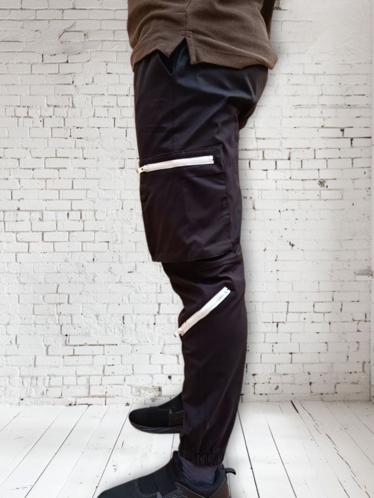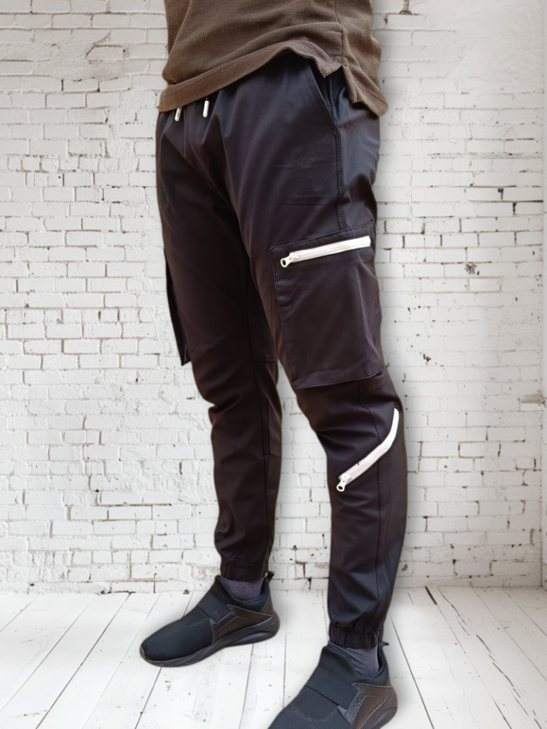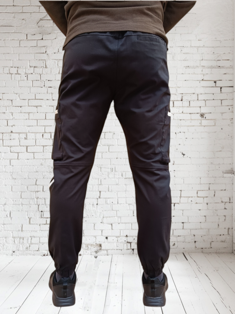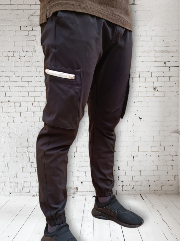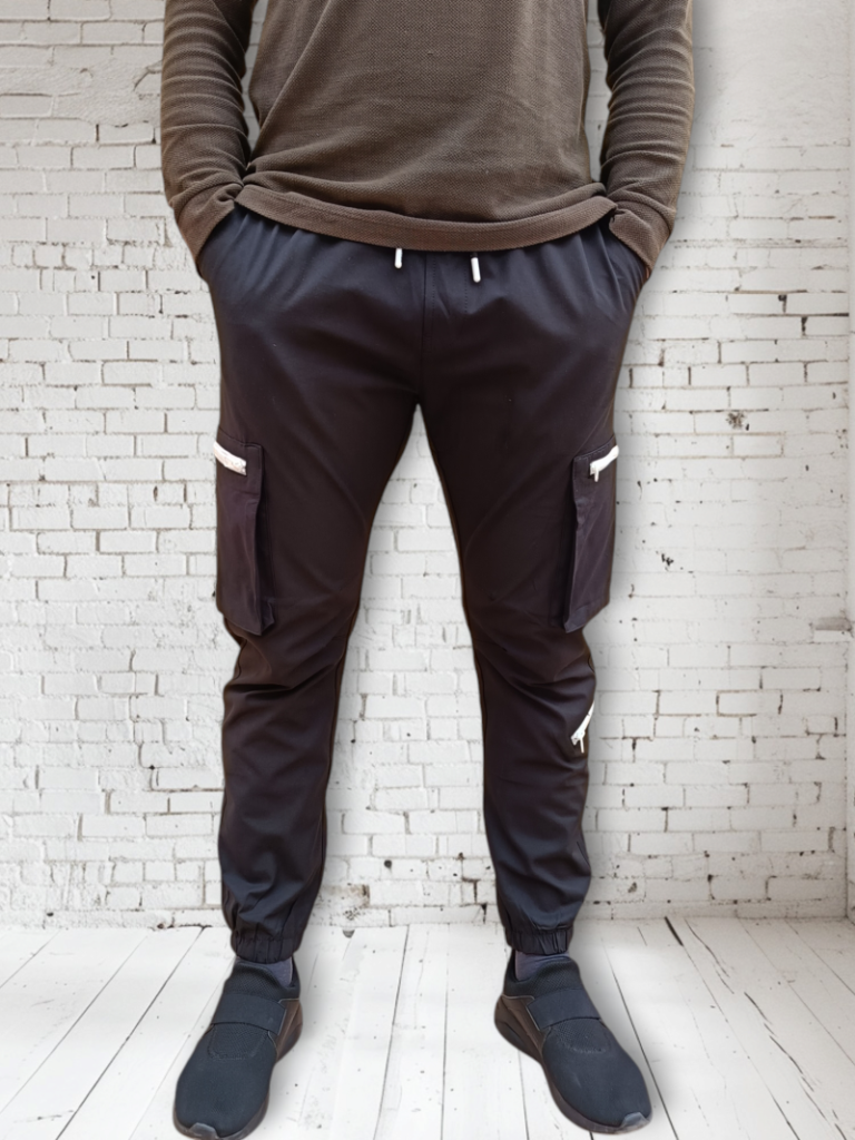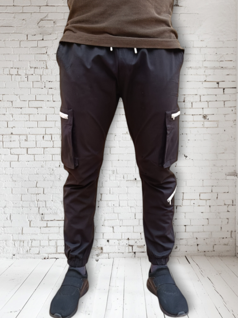 Pantalon jogger cargo basique en tissu extensible, avec 5 poches , chevilles élastiques et taille Elastiquée et ajustable par cordon.