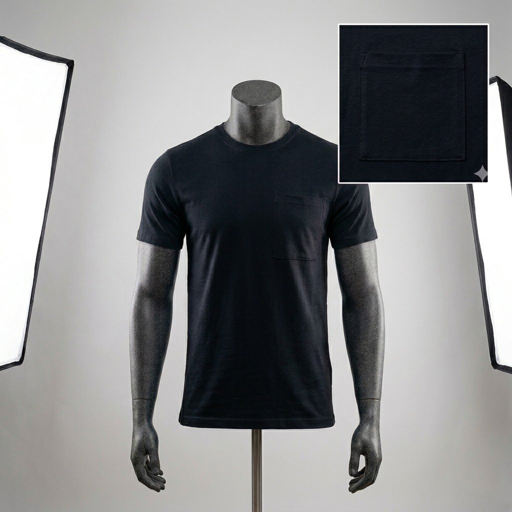 • La Poche Carrée Iconique : Située sur la poitrine, cette poche plaquée aux angles nets apporte une touche géométrique moderne qui casse la simplicité du t-shirt uni.